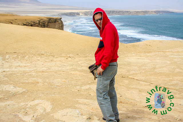 Cogemos una pequeña guagua que nos lleva a la entrada de dicho parque, una vez pagado el ingreso que son S/. 5 (soles), seguimos camino hacia el parque, a unos pocos minutos nos bajamos de la guagua donde Ricardo nos explica que la carretera por la que estamos circulando no es asfalto sino una mezcla de sal, arcilla y el paso de lo caminos con sus gomas le han dado el color negro, como todo buena explicación nos hace una demostración in sito donde se demuestra que es sal y algo más lo que pisamos. También nos explica el motivo de las montañas de conchas de ostras que podemos ver a los lados de la carretera, para no contarlo todo lo dejamos como un misterio para que aquellos que visiten la zona tengan algunas sorpresas y no contarlo todo en este blog. En esta parada entablamos conversación con un chico de Barcelona, llamado Xavier, qué también esta viajando por Perú. Llegamos a la formación rocosa llamada Catedral, que en el último terremoto a perdido su forma que le ha dado fama, pero así y todo es aconsejable ver toda la costa que podemos contemplar desde este mirador natural, donde vemos como los pescadores usan una cuerdas para poder bajar el acantilado, 52 metros de altura, para poder pescar en la misma orilla del océano.